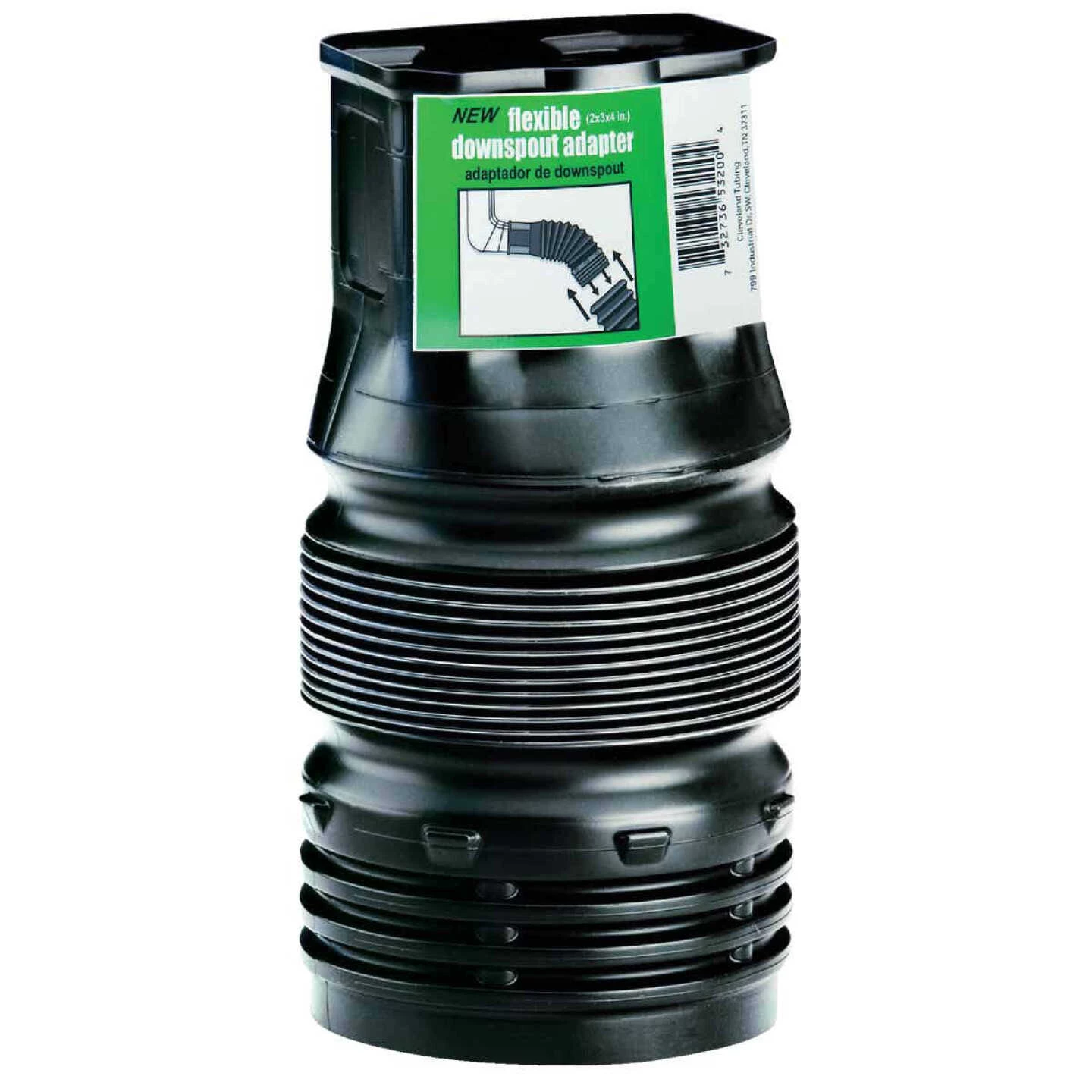 Available in both 2″ x 3″ x 4″ and 3″ x 4″ x 4″ sizes. It is used to connect your downspout to FLEX-Drain , 4″ standard corrugated pipe, 4″ PVC, and most other 4″ pipe. The flexible design allows an easier connection with mroe versatility than standard rigid adaptors.